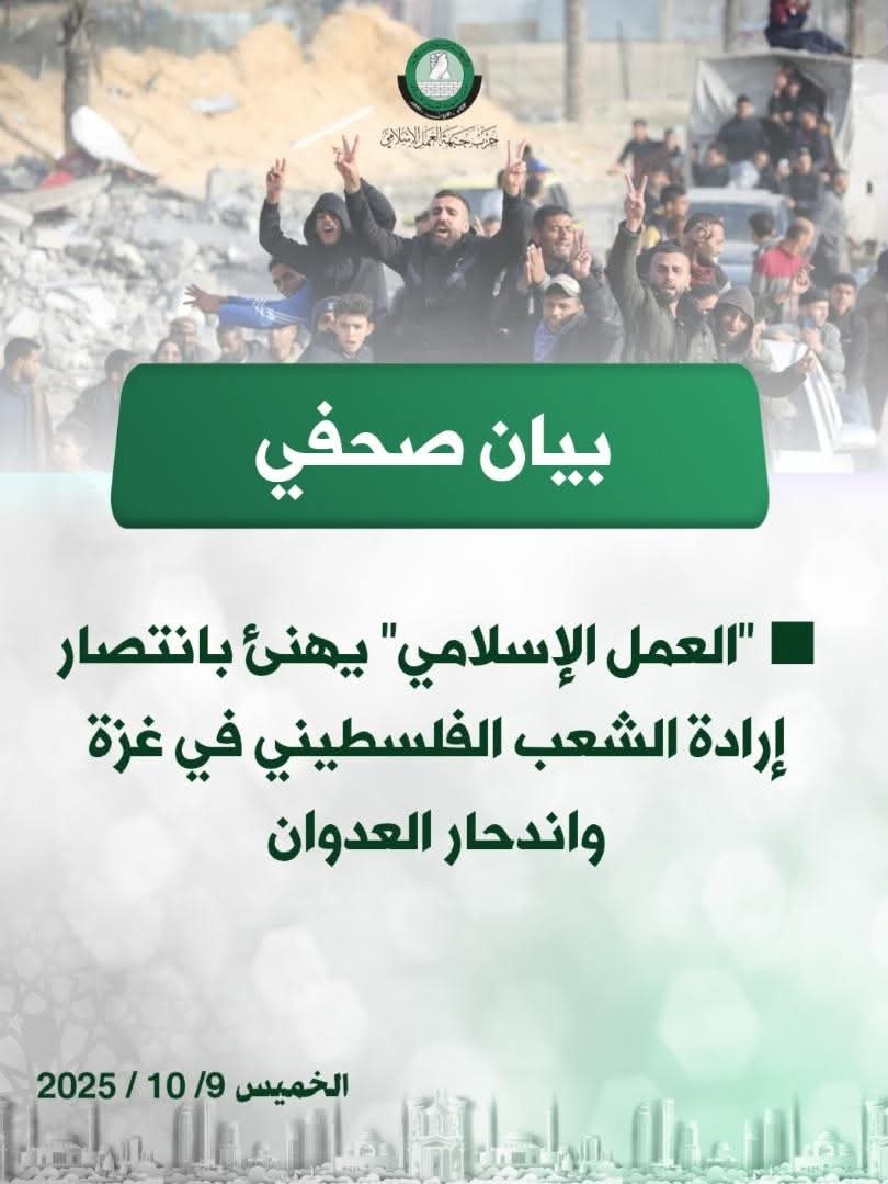 يتقدم حزب جبهة العمل الإسلامي إلى الشعب الفلسطيني الصامد البطل ومقاومته الباسلة، بالتهنئة والافتخار، بانتصار الإرادة الفلسطينية على العدو الصهيوني المجرم وآلته العسكرية التي مارست حرب إبادة جماعية وجرائم حرب غير مسبوقة بشراكة أمريكية ودعم غربي ورغم التخاذل العربي الرسمي على مدى أكثر من عامين سطّر فيها الشعب الفلسطيني ملاحم البطولة والصمود على أرضه وتمسكه بالمقاومة وقدم اكثر من 67 ألف شهيد ونحو 200 ألف مصاب وآلاف المفقودين على طريق النصر والتحرير.
