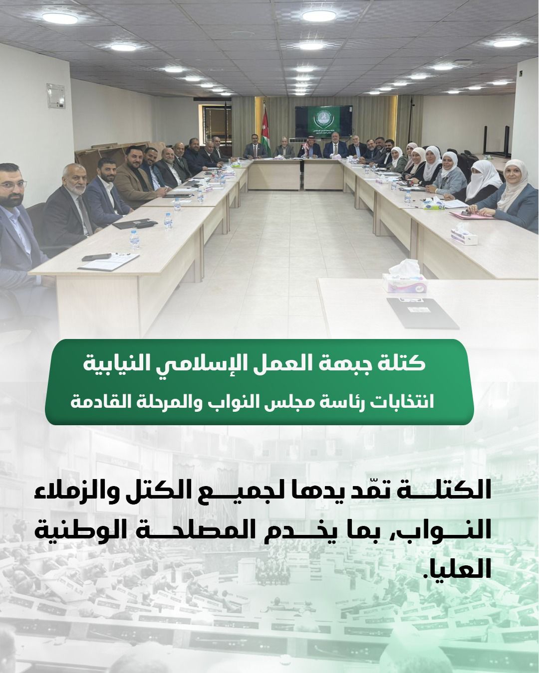 انطلاقاً من إيمانها الراسخ بدور مجلس النواب في خدمة الوطن والمواطن، ومواصلة لمسيرتها في تعزيز العمل البرلماني الجاد والرقابة الحقيقية والتشريع المسؤول والعمل المؤسسي، وحرصاً على أمن البلد وسيادته واستقراره، تؤكد كتلة جبهة العمل الإسلامي النيابية على مدّ يدها لجميع الكتل والزملاء النواب، بما يخدم المصلحة الوطنية العليا، في ظلّ ما يحيط بوطننا من ظروف إقليمية دقيقة وتحديات خارجية وداخلية متصاعدة على مختلف المستويات.
