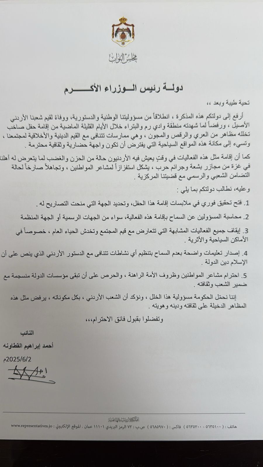 مذكرة من النائب القطاونة لرئيس الوزراء تطالب بفتح تحقيق خول ملابسات حفل وادي رم ومنع أي فعاليات تتنافى مع قيم المجتمع وهويته