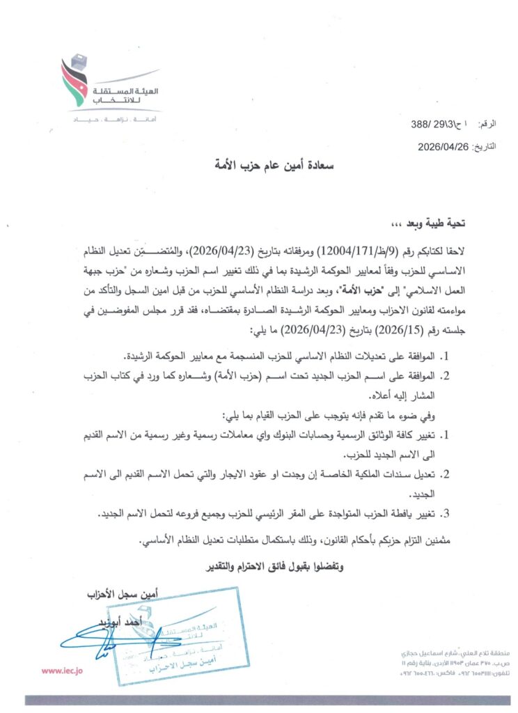 أعلن حزب الأمة تسلمه كتابًا رسميًا خطيًا من الهيئة المستقلة للانتخاب، يتضمن الموافقة على التعديلات التي أُدخلت على النظام الأساسي للحزب، بما في ذلك اعتماد الاسم الجديد للحزب وشعاره، وذلك في إطار استكمال الإجراءات القانونية والتنظيمية الناظمة لعمل الأحزاب.